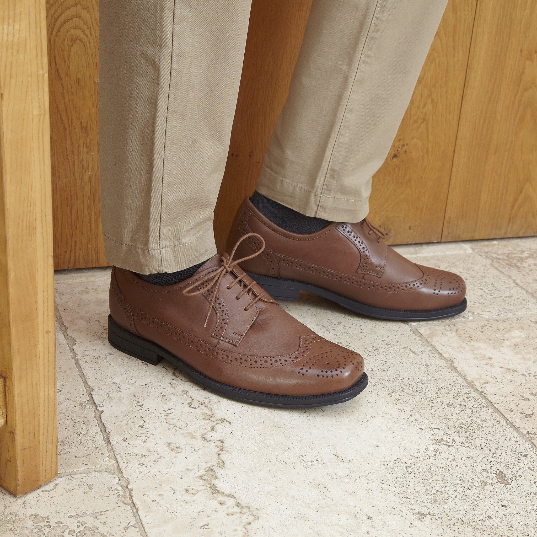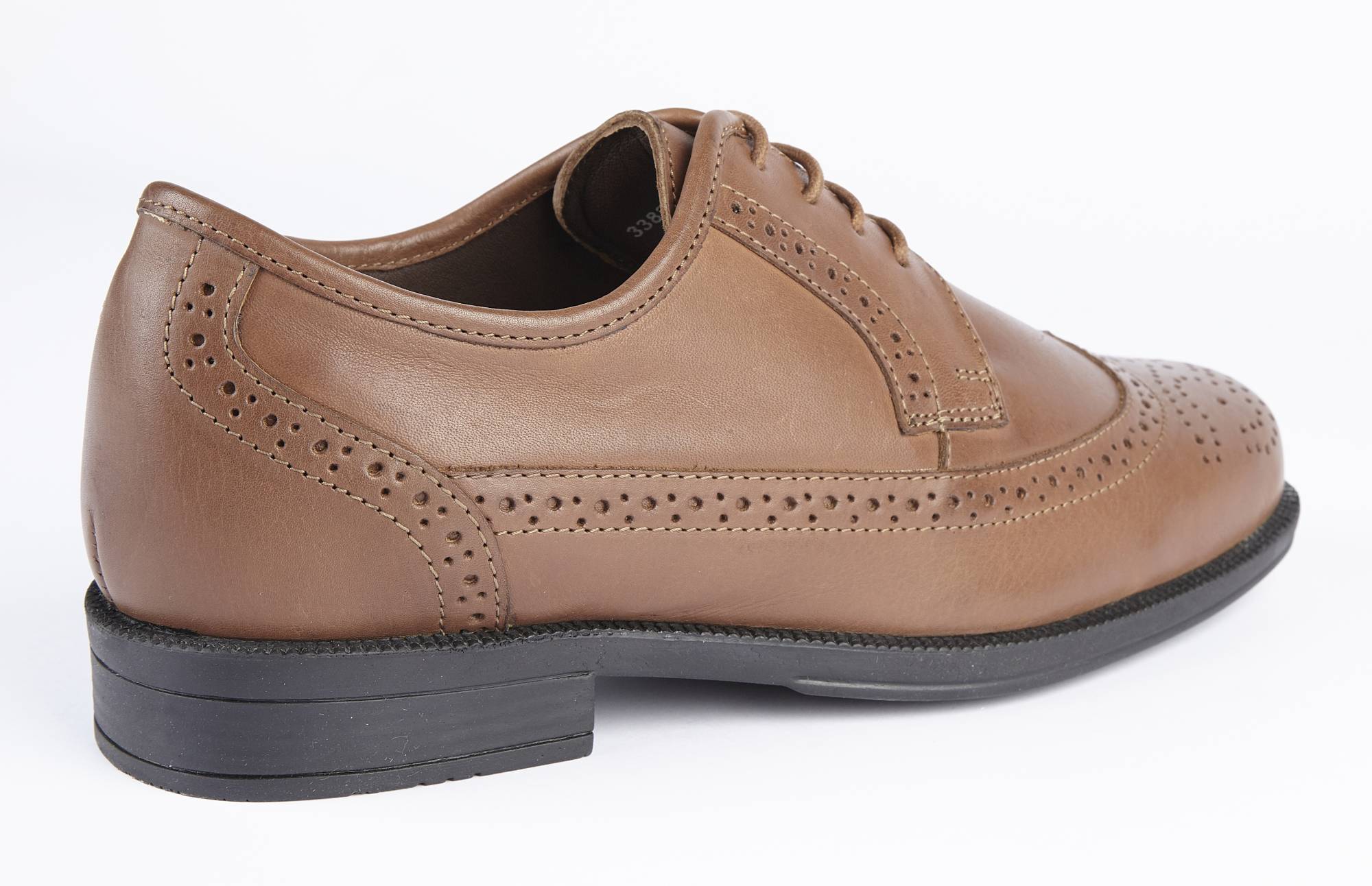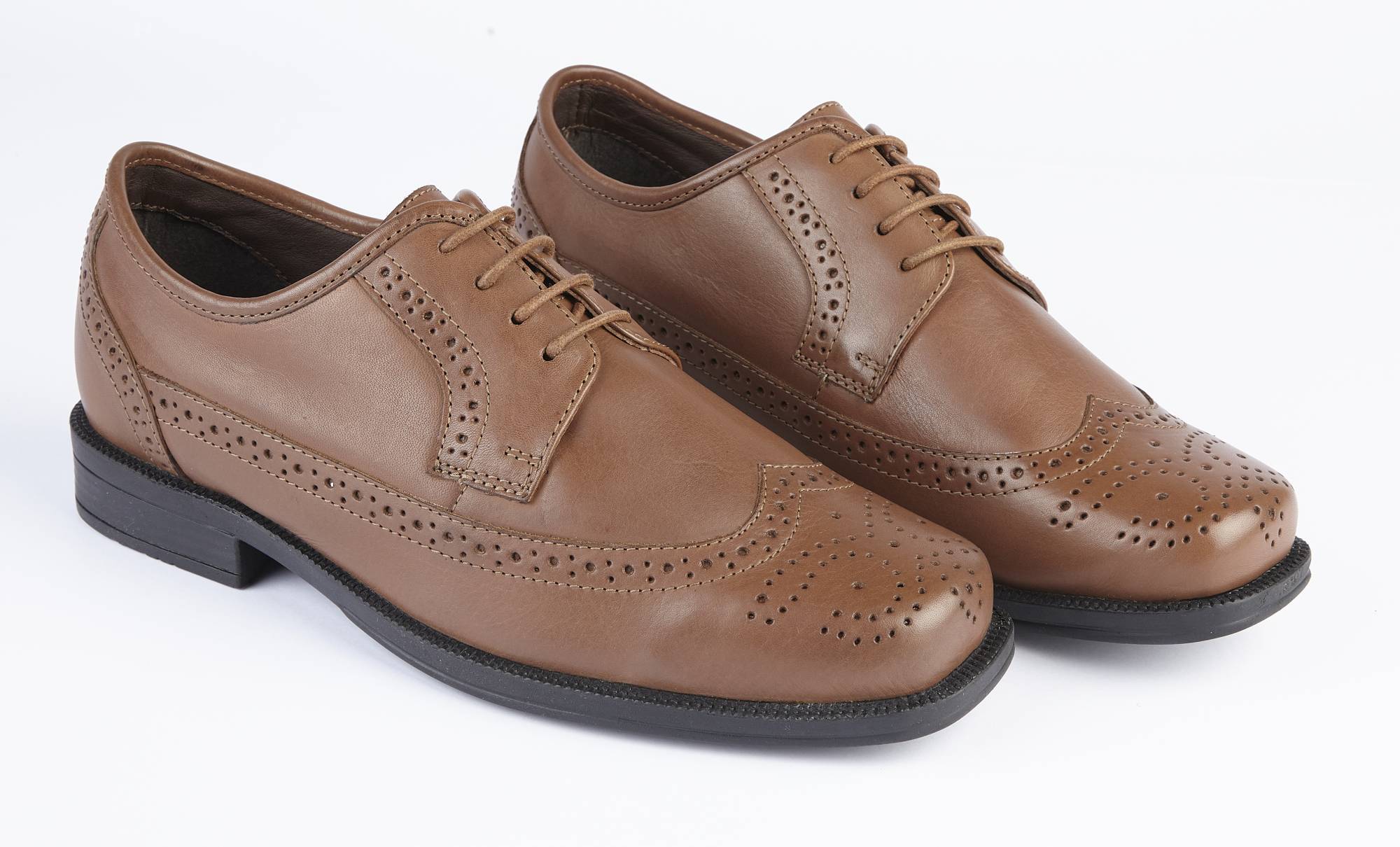 An oxford brogue, with a genuine soft leather upper, soft leather lining and cushioned leather insole. It has plenty of room at the toe area, and a rubber sole with a one inch heel. It is an H fitting shoe (wider than regular)