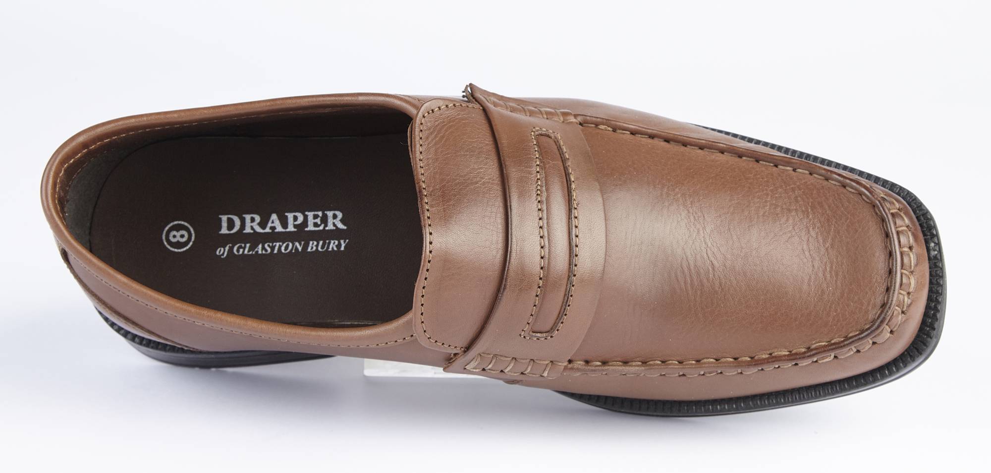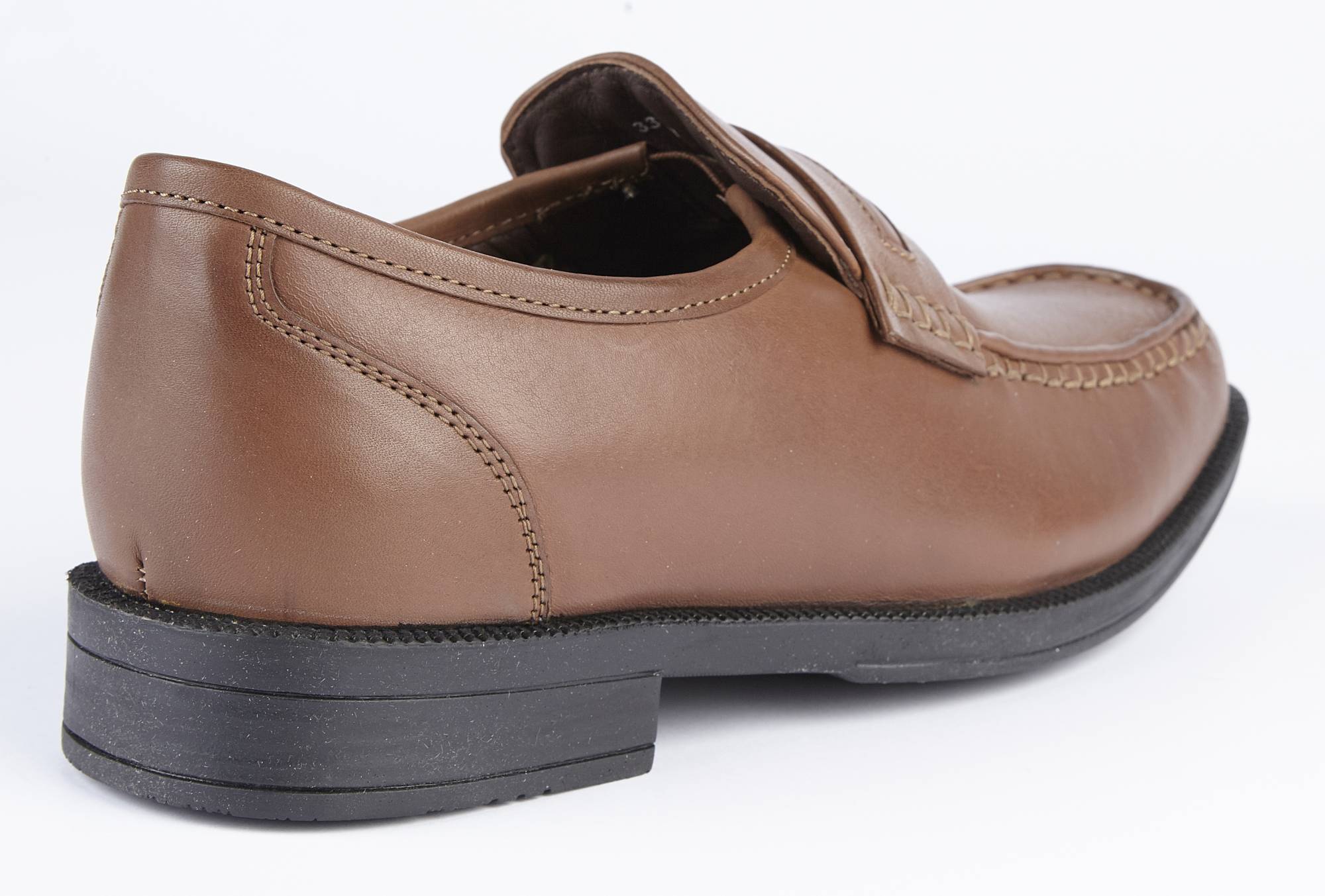Our men's loafer, with a soft leather upper, soft leather lining, and cushioned leather insole. It has plenty of room at the toe area, and a rubber sole with a one inch heel. It is an H fitting shoe (wider than regular)