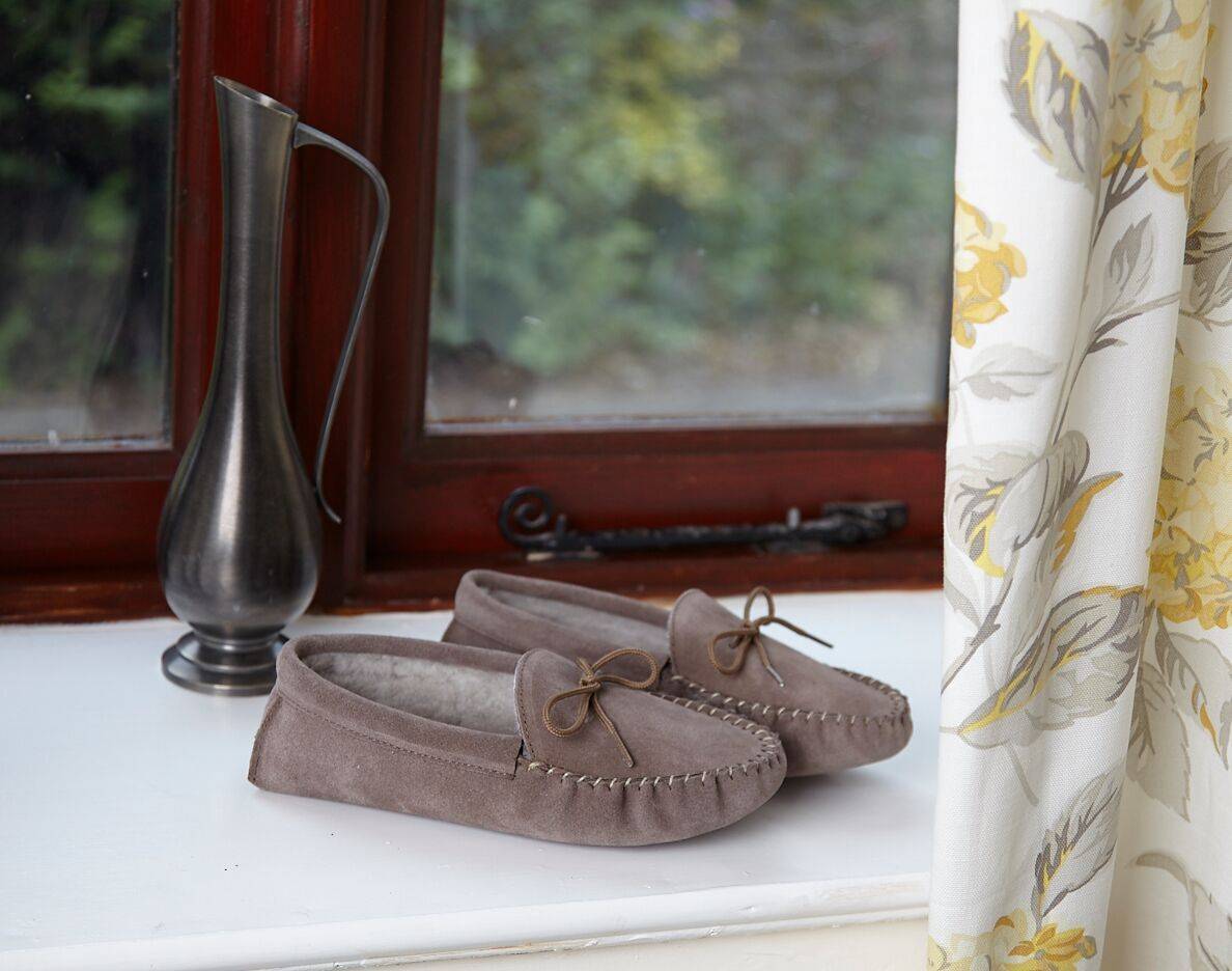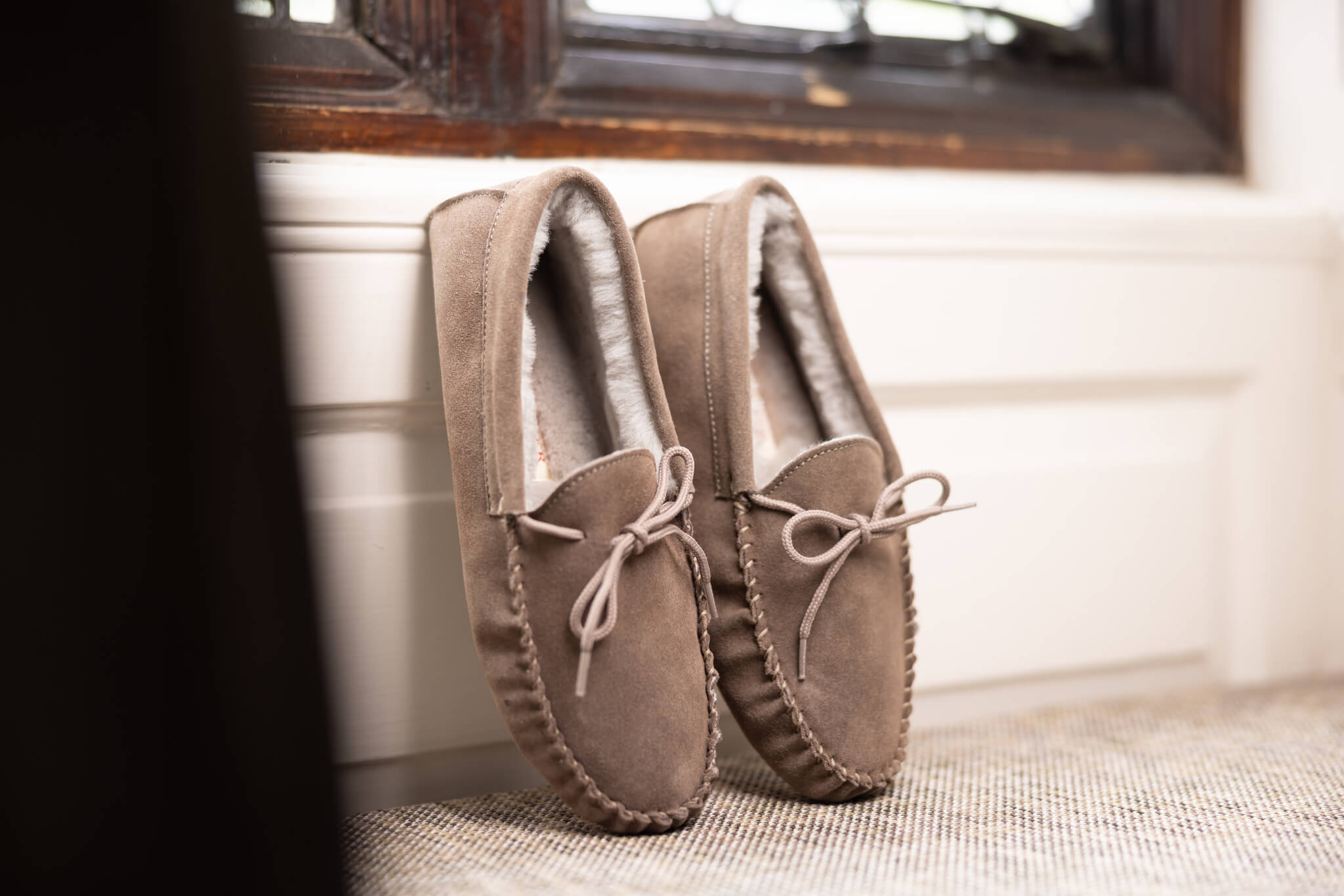 These timeless classic soft sole moccasins have natural sheepskin lining. These sheepskin moccasins have suede uppers and sheepskin lining and suede soft soles. Comfort and hard wear are the highlights of these high-quality leather moccasins. Made in England.