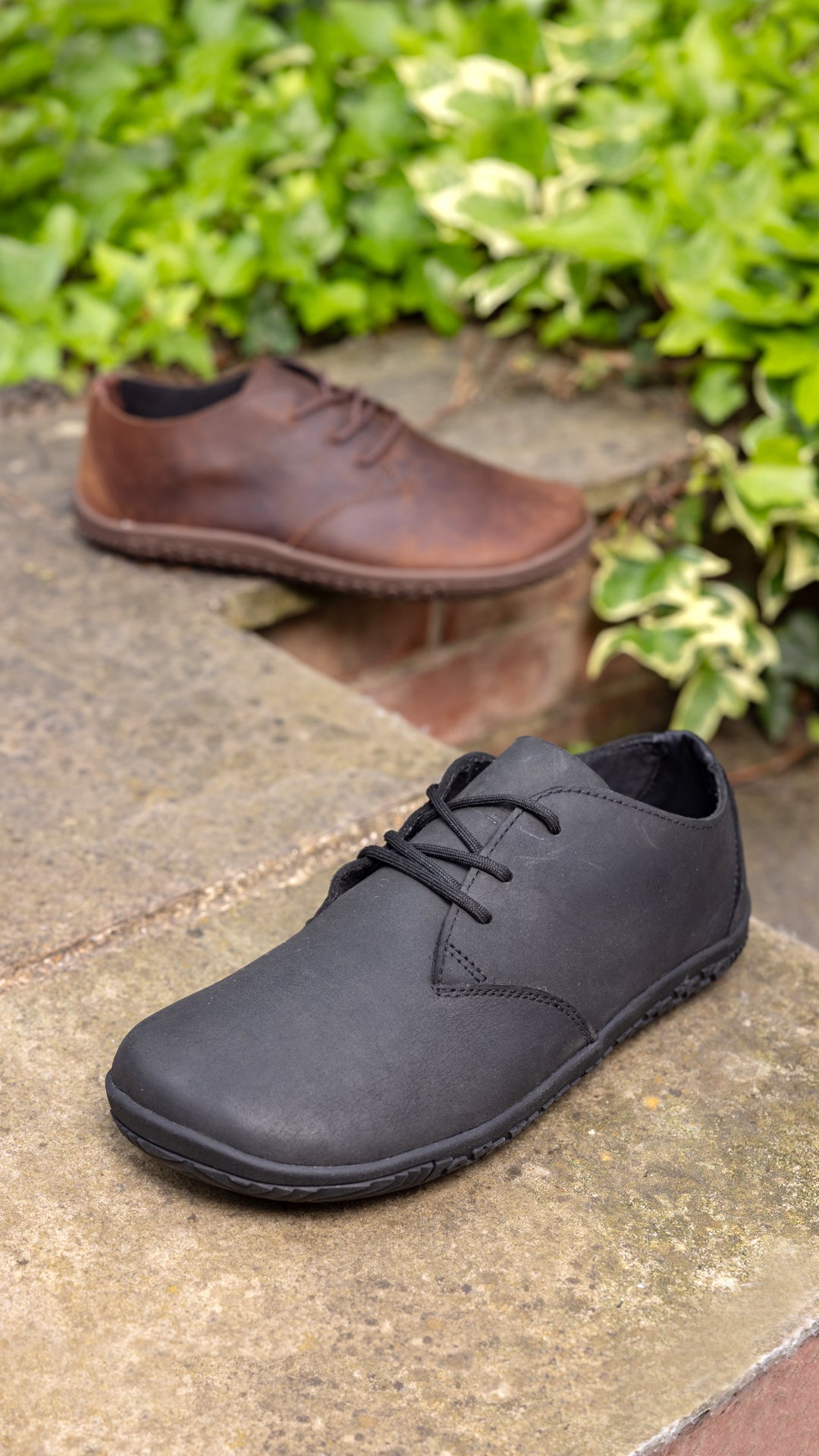 In collaboration with BARELY, these black, waxed leather, water resistant barefoot shoes are new to our collection.